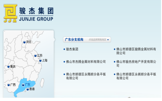 在集团的不断发展和壮大推进下,骏杰集团在佛山、香港、上海、江苏、深圳、河北、广西和重庆等地分别成立了数家分公司。其中,在佛山先后成立了骏腾金属材料有限公司、杰腾金属材料有限公司、德茂金属材料有限公司、骏杰房地产开发有限公司、以及永祺顺和永赐顺两个平板加工厂,在上海先后成立了武骏金属材料有限公司和粤杰金属材料有限公司,在江苏昆山置地20000平方米建立了集销售、仓储、加工、配送等为一体的综合性的大型物流中心,在广西和重庆分别成立了投资咨询有限公司,在河北尚义投建了矿业公司等。另外,集团现正开拓国际贸易业务,参与钢铁深加工业,开发钢铁行业的原材料市场。